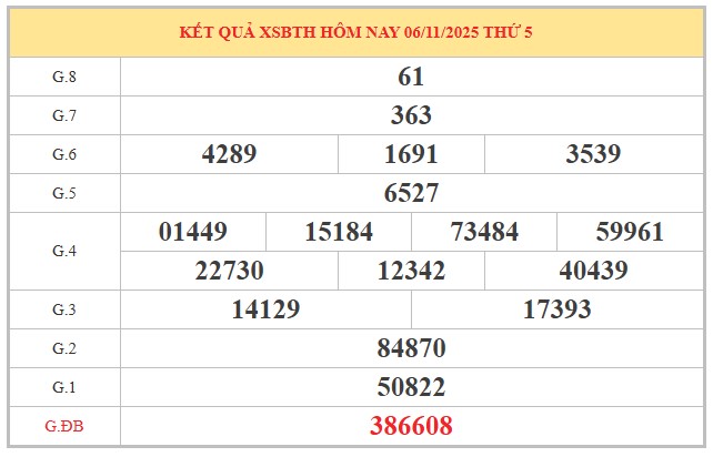 Trong kỳ quay gần nhất, bảng kết quả XSBTH ghi nhận sự xuất hiện nổi bật của các đầu và đuôi số có tính lặp cao. Cụ thể, hai cặp số 39 và 84 cùng xuất hiện 2 lần, cho thấy xu hướng ổn định của nhóm số này. Đầu số 2, 3, 6, 8 tiếp tục chiếm ưu thế với 3 lần góp mặt trong các giải, chứng minh sức mạnh đáng kể của nhóm đầu cao.