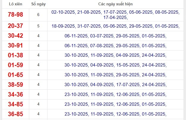 Thống kê lô xiên về gần đây: 78 – 98, 20 – 37, 30 – 42, 30 – 91, 01 – 38.