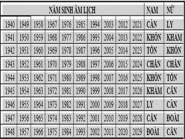 Cách tra mệnh các năm